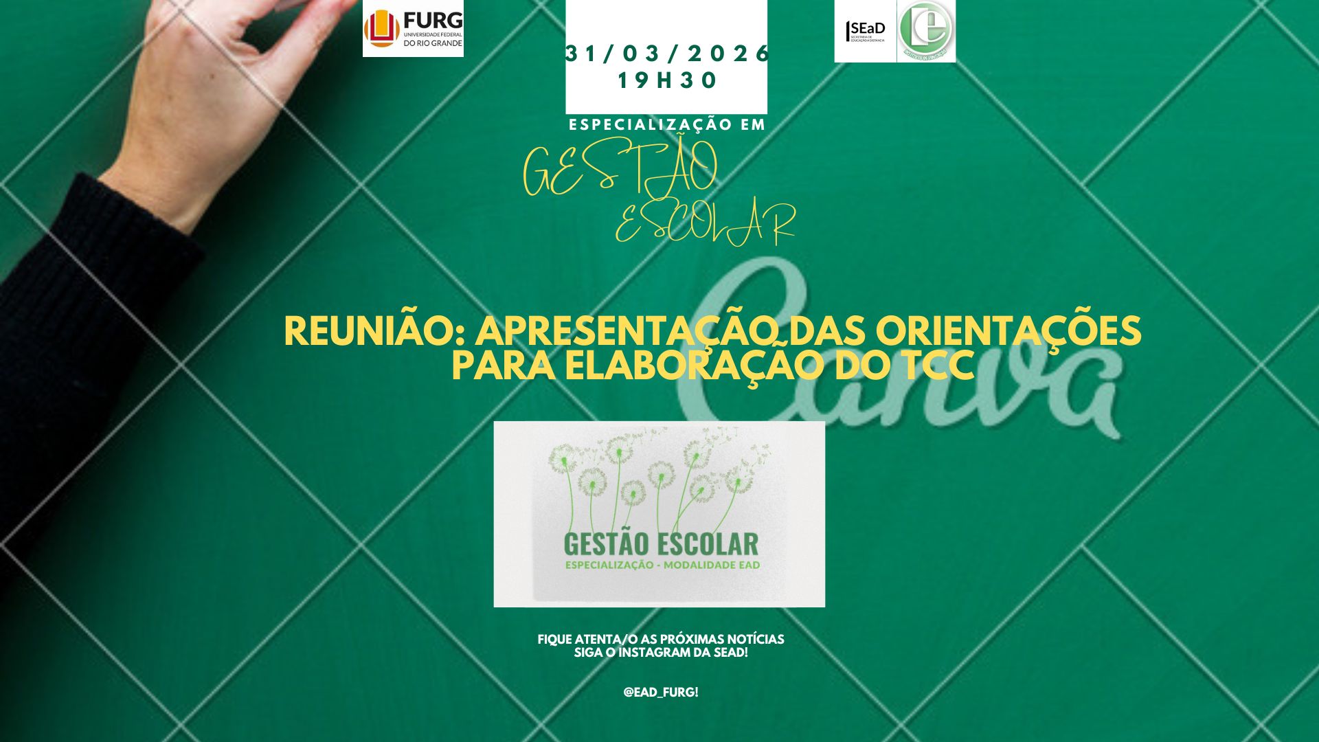 A Coordenação do Curso de Gestão Escolar EAD promove, no dia 31 de março, às 19h30, uma reunião com os discentes para apresentar as orientações para elaboração do Trabalho de Conclusão de Curso (TCC). Mais informações podem ser obtidas junto à coordenação do curso.