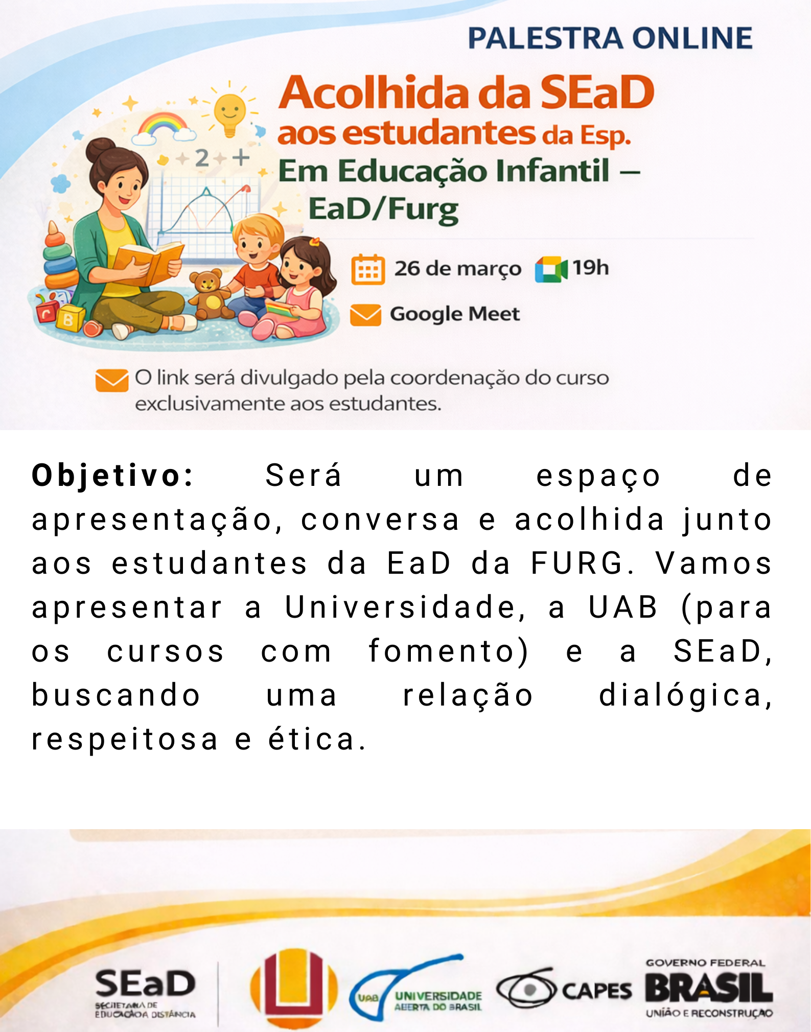 A Secretaria de Educação a Distância - SEAD promove, no dia 26 de março, quinta-feira, a partir das 19h, sua acolhida aos estudantes da Especialização em Educação Infantil EAD. O link para acesso será divulgado pela coordenação do curso. Mais informações estão disponíveis no card abaixo.