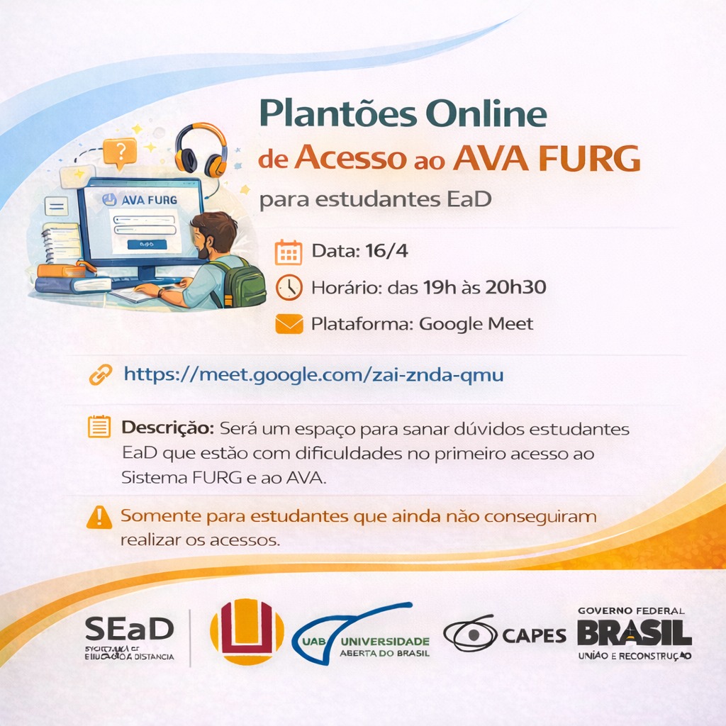 A Secretaria de Educação a Distância - SEAD promove, no dia 16 de abril, um novo plantão de acesso ao Sistema FURG e AVA aos estudantes EAD que ainda estão com dificuldades de acesso.